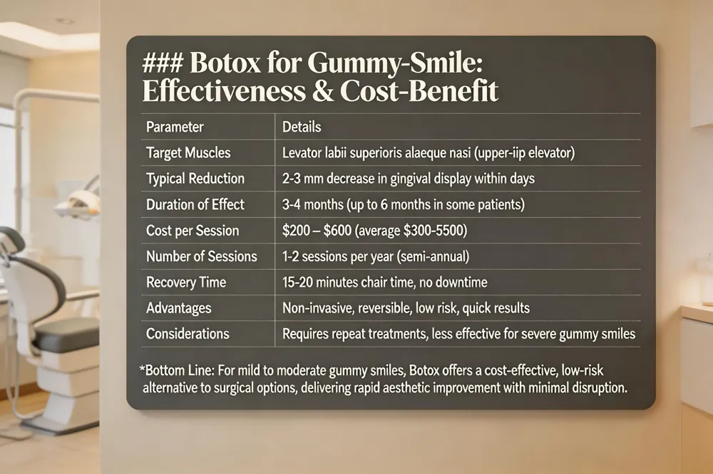 - Botox injections for a hyperactive upper lip cost $200‑$600 per session and typically reduce gummy display for 3‑4 months (up to 6 months in some cases).
