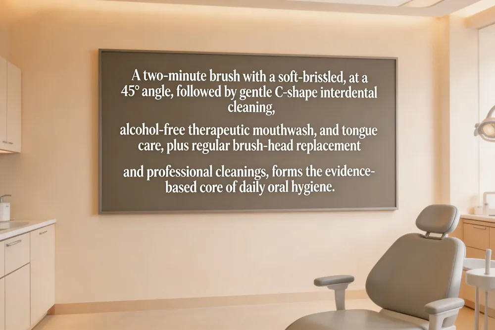 A solid oral‑care routine starts with a two‑minute brush using a soft‑bristled toothbrush and fluoride toothpaste, angled 45° toward the gum line to cover all surfaces, including the tongue. Follow with daily interdental cleaning—floss, interdental brushes, or a water flosser—using a gentle “C‑shape” motion to disrupt plaque between teeth and under the gum line. Finish with an alcohol‑free therapeutic mouthwash swished for 30‑60 seconds; avoid eating or drinking for at least 30 minutes afterward. Dentists stress the importance of replacing the brush head every three months, limiting sugary snacks, staying hydrated, and using products bearing the ADA Seal of Acceptance. Adult‑specific tips include avoiding tobacco, moderating alcohol, managing diabetes, and chewing xylitol‑sweetened gum to stimulate saliva. Schedule professional cleanings and exams at least twice a year, and consider a custom mouthguard for sports. This evidence‑based sequence—brush, floss (or interdental clean), rinse, and tongue care—optimizes plaque removal, reinforces enamel, and supports overall health.