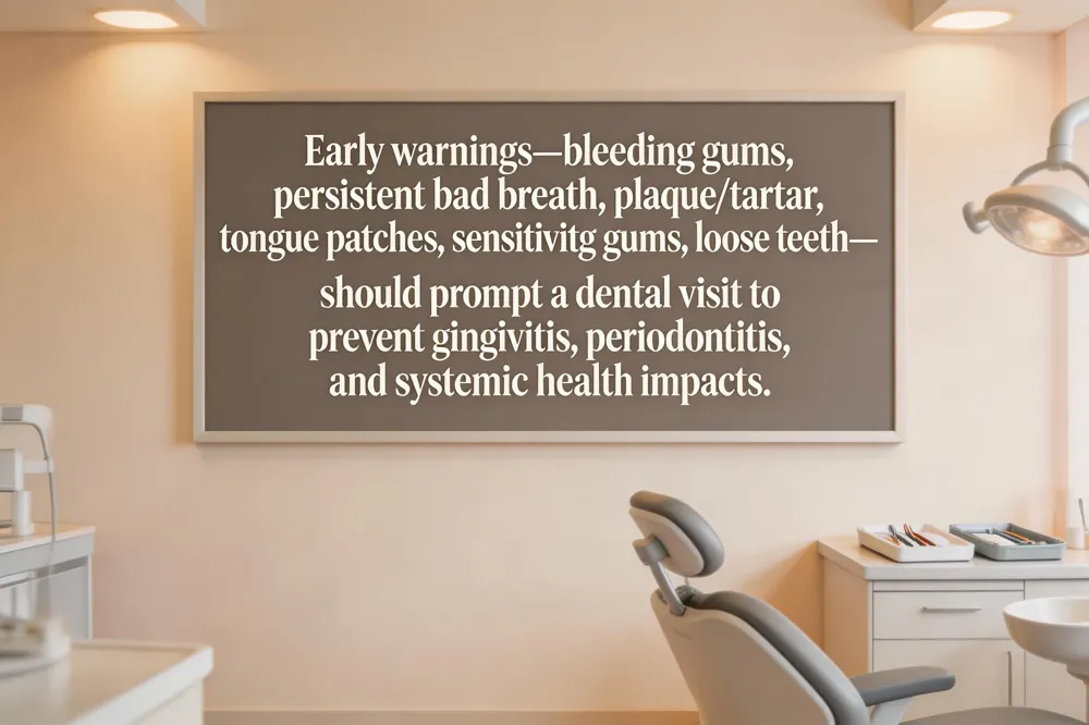 Bleeding gums, persistent bad breath, and visible plaque or tartar on the teeth are the most common early warnings of inadequate oral care.