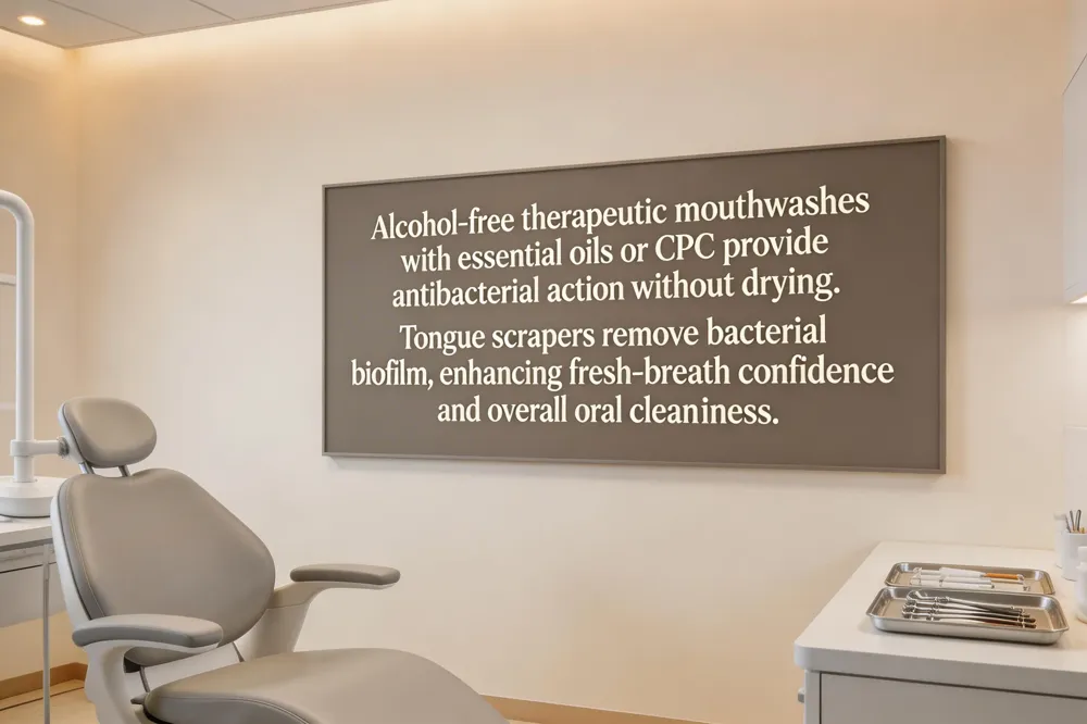 Alcohol‑free therapeutic mouthwashes, such as those containing essential oils or cetylpyridinium chloride (CPC), provide antibacterial action without the drying effect of alcohol, making them gentler on oral tissues while still reducing plaque and gingivitis. Essential‑oil rinses (eucalyptol, menthol, methyl salicylate, thymol) and CPC formulations are ADA‑approved for daily use and have been shown to lower gingival inflammation when used adjunctively with brushing and flossing.