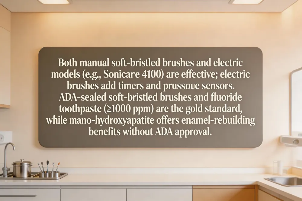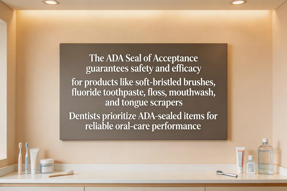 The ADA Seal of Acceptance shows a product passed strict safety and efficacy tests; more than 400 items—toothpaste, floss, mouthrinses, toothbrushes, water filters—bear it, renewed every five years. Dentists favor a soft‑bristled toothbrush , preferably an ADA‑approved electric model with timer and pressure sensor, to remove plaque gently. Fluoride toothpaste (≥1000 ppm) strengthens enamel, while daily floss or interdental brushes clean interproximal areas. An alcohol‑free antimicrobial mouthwash and tongue scraper reduce bacterial load and bad breath; desensitizing toothpaste or a water flosser such as Waterpik helps patients with sensitivity or limited dexterity.