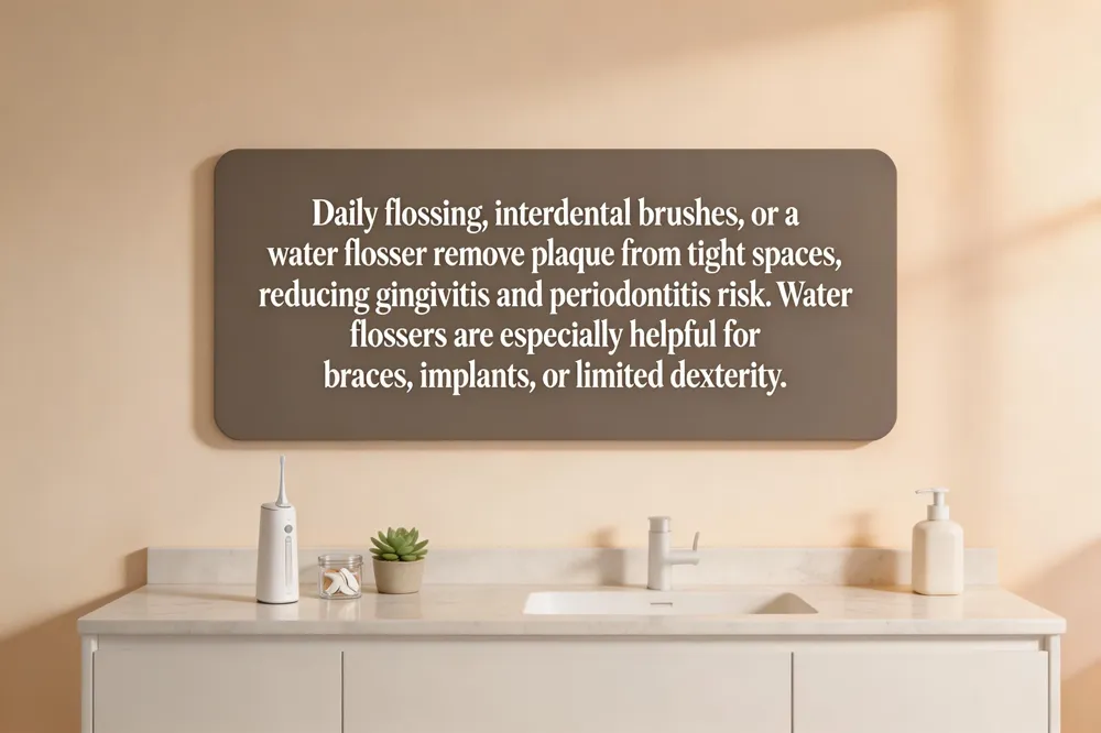 Interdental cleaning is essential because toothbrushes cannot reach the tight spaces where plaque builds up. Daily flossing, using interdental brushes, or employing a water flosser removes biofilm and food debris, lowering the risk of gum disease and gingivitis. Studies show that consistent interdental cleaning reduces periodontitis prevalence, and water flossers are especially effective for patients with braces, implants, or limited dexterity.