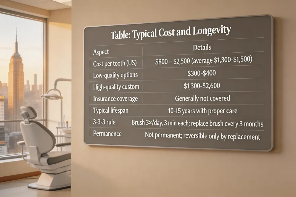 | Porcelain veneers in the United States typically cost between $800 and $2,500 per tooth, with most patients paying around $1,300 to $1,500 each. The price varies based on the dentist’s experience, the laboratory that fabricates the veneers, the number of teeth treated, and any additional procedures such as tooth preparation or gum contouring. While lower‑quality options may start near $300‑$400, high‑quality, custom‑crafted porcelain veneers usually fall in the $1,300‑$2,600 per‑tooth range. Cosmetic veneers are generally not covered by insurance, so many patients use financing or payment plans offered by the practice. |