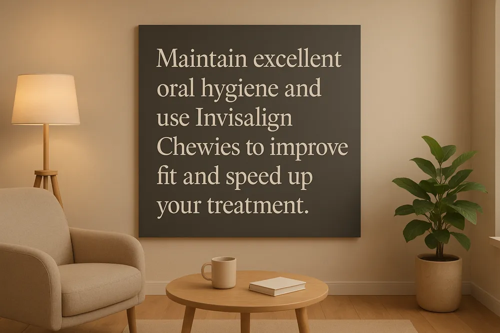 Good oral hygiene—brushing and flossing after meals and cleaning aligners properly—prevents cavities and gum problems that could stall treatment. Using helpful tools like Invisalign Chewies improves aligner fit, enhancing effectiveness.