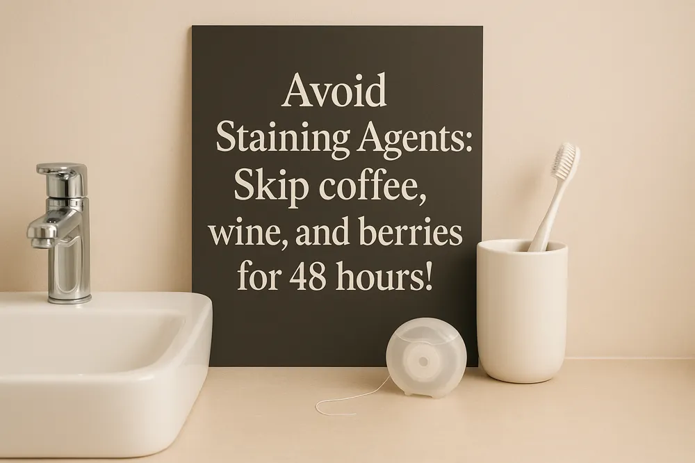 After teeth whitening, it’s important to avoid colored beverages like coffee, tea, soda, and red wine, as well as dark sauces (such as soy sauce and tomato-based sauces). Citrus and other acidic fruits, high-sugar foods and drinks, and tobacco products should also be limited or avoided. These substances can stain teeth and irritate sensitive enamel during the critical first 24 to 48 hours post-treatment. For detailed guidance, see Foods to Avoid After Teeth Whitening.